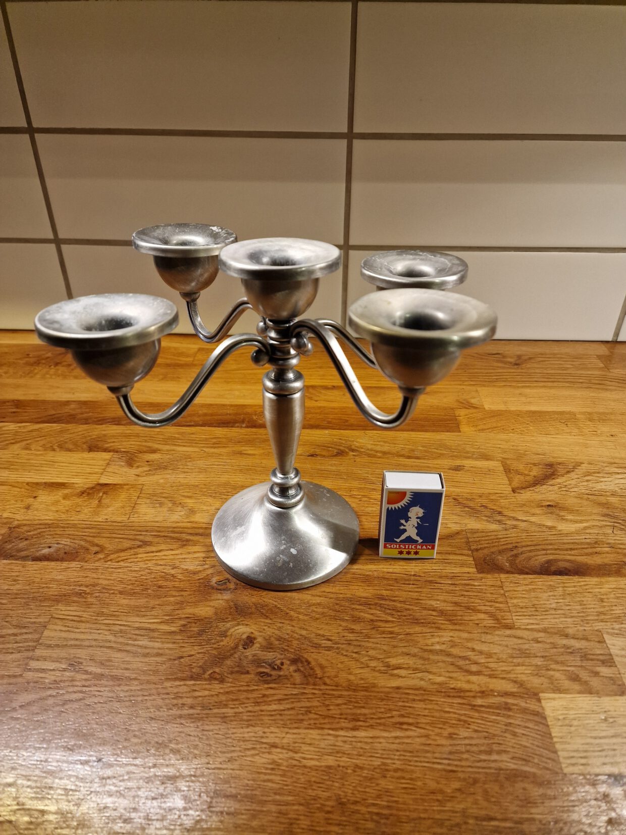 5592) Kandelaber 40 kr, stearinrester.