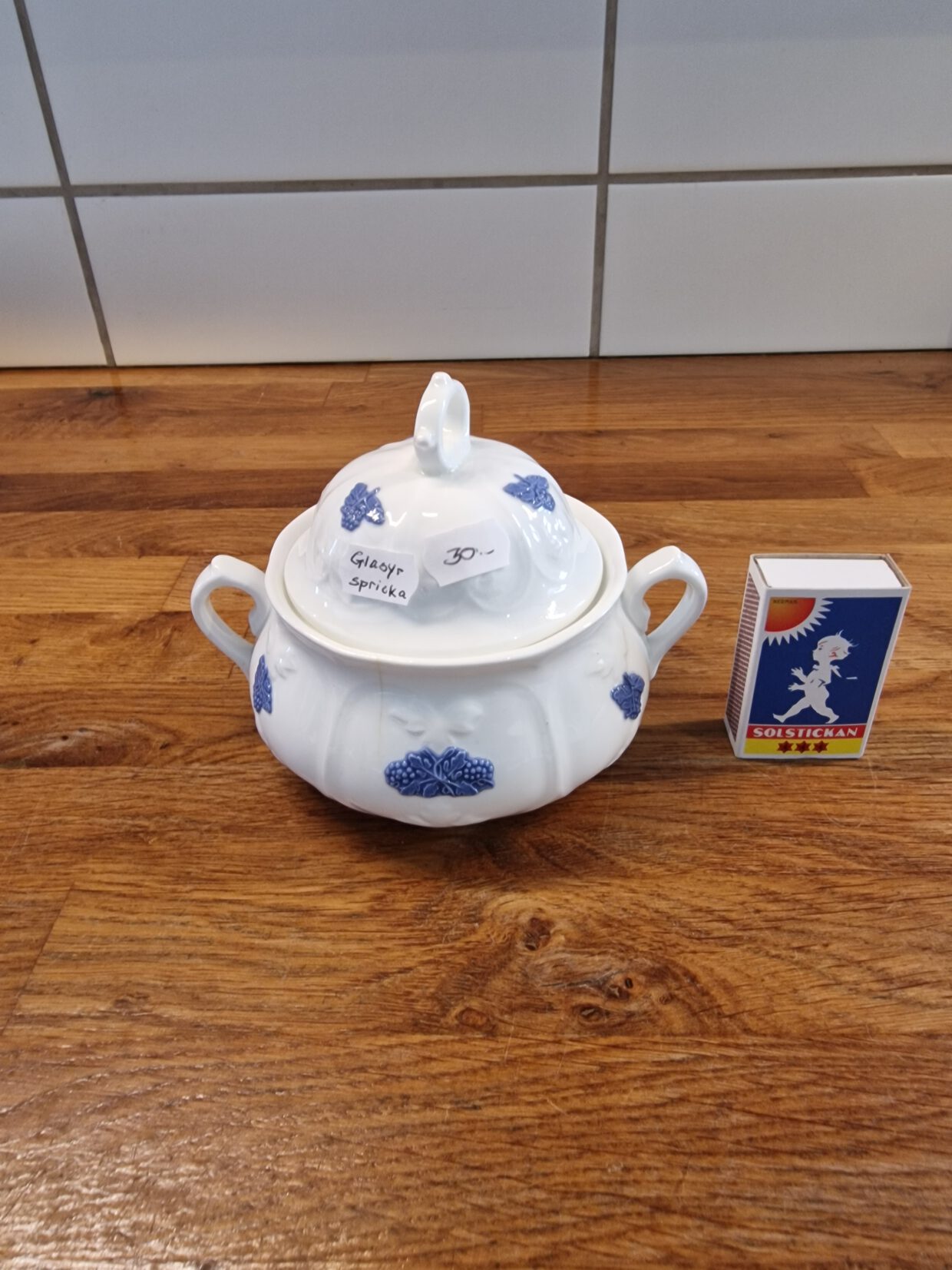 4946) Gustavsberg Blå blom sockerskål 30 kr, har en glasyrspricka. Säljstart 27 april.