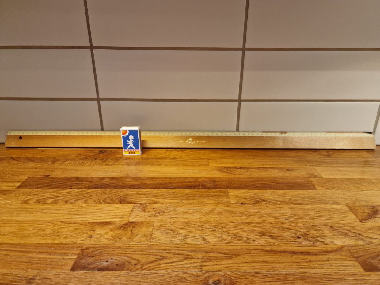 4244) Linjal 80 cm 20 kr, slitage.